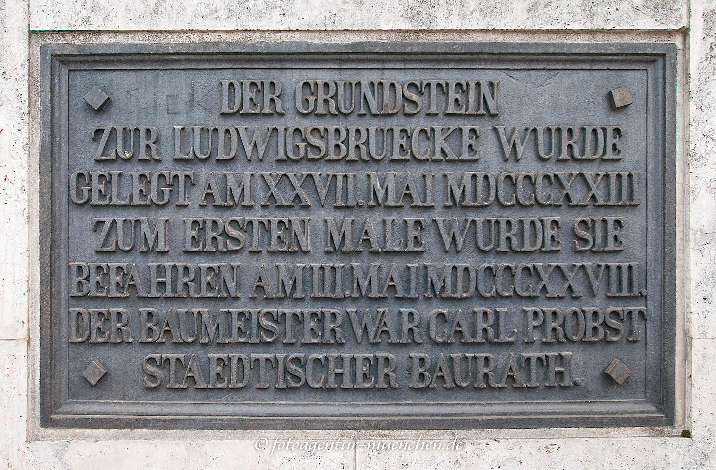 <p>Der Grundstein zur Ludwigsbrücke wurde gelegt am 27. Mai 1823. Zum ersten Male wurde sie befahren am 3. Mai 1828. Der Baumeister war Carl Probst Städtischer Baurath.</p>